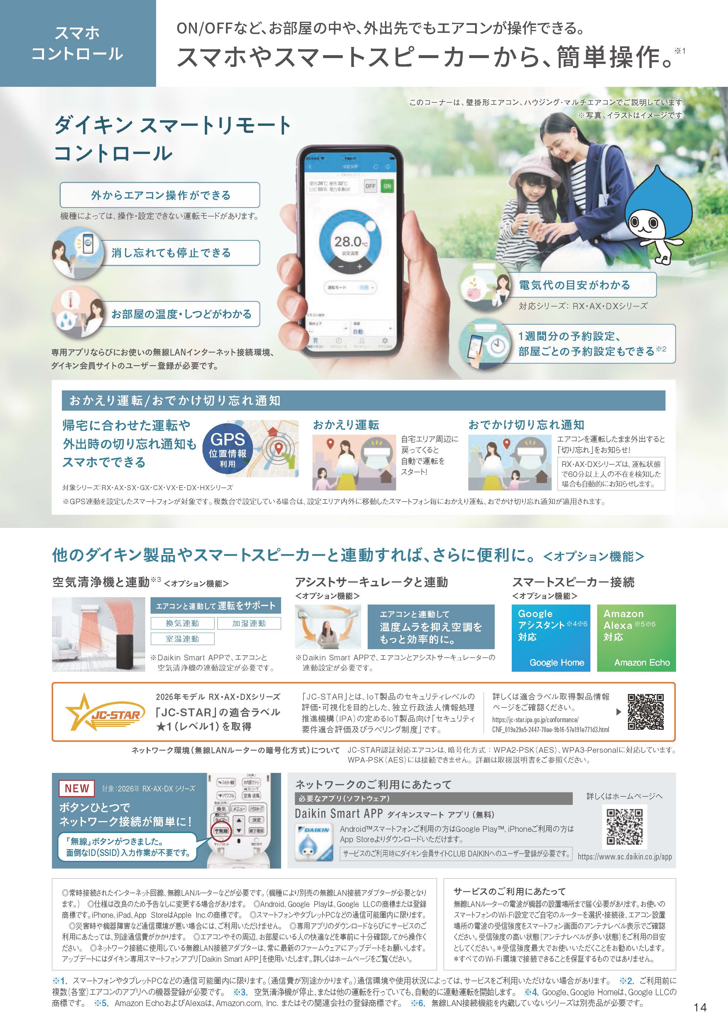 専用アプリによりお使いのスマートフォンやタブレットからエアコンのリモコンに早変わり。家の中でも外出先でも自在にエアコン操作が行えるので、外出先から帰宅する前にエアコンを作動させておくことで帰った瞬間から快適な空気環境のお部屋で過ごせます。またスマートスピーカーや見守りセンサー等の機器とも連携可能です。