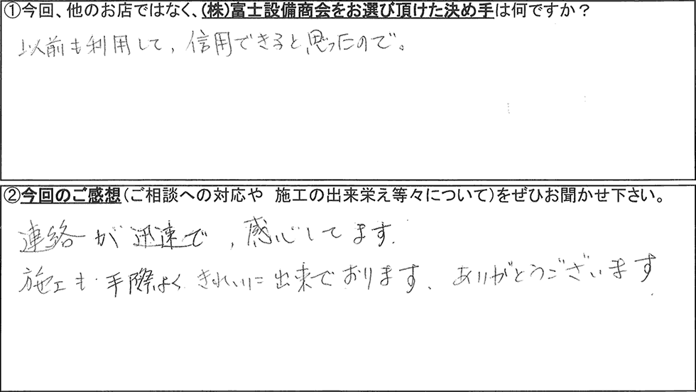 株式会社富士設備商会でダイキンエアコンの設置・交換工事を施工させて頂いたお客様からのご感想を紹介します(お名前や住所等の個人情報につきましては、それぞれのお客様から御許可頂いた範囲での公開としております)。