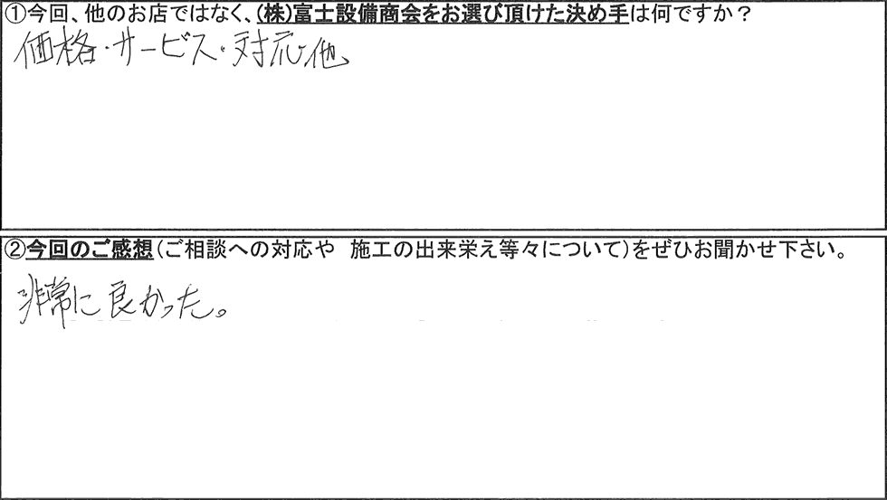 株式会社富士設備商会でダイキンエアコンの設置・交換工事を施工させて頂いたお客様からのご感想を紹介します(お名前や住所等の個人情報につきましては、それぞれのお客様から御許可頂いた範囲での公開としております)。 非常に良かった。 T 様東京都 2025年4月施工 マンション S28ZCV(ダイキン天井埋込形ルームエアコン)1台 富士設備商会を選んだ決め手は? 価格・サービス・対応他 今回のご感想 非常に良かった。 <<No.705 T様「連絡が迅速で、感心してます。」(2025/4 東京都渋谷区)へ No.707 T様>>「見積もりから工事まで、段取良く対応してもらったと思います。」(2025/4 東京都世田谷区)へ
