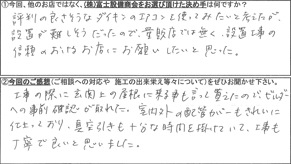 株式会社富士設備商会でダイキンエアコンの設置・交換工事を施工させて頂いたお客様からのご感想を紹介します(お名前や住所等の個人情報につきましては、それぞれのお客様から御許可頂いた範囲での公開としております)。
