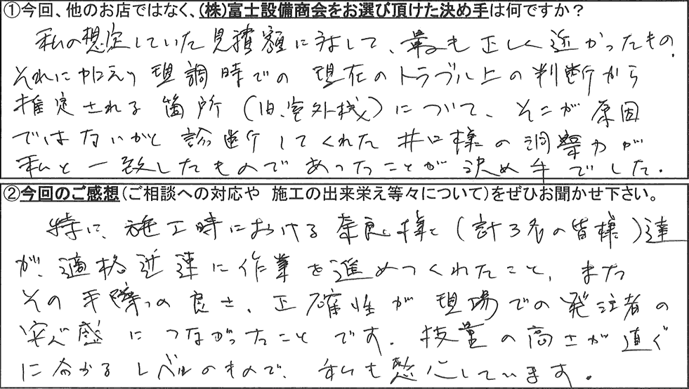 - 私の想定していた見積額に対して、最も正しく近かったもの、それに加えて現調時での現在のトラブル上の判断から推定される個所(旧室外機)について、そこが原因ではないかと診断してくれた井口様の洞察力が私と一致したものであったことが決め手でした。