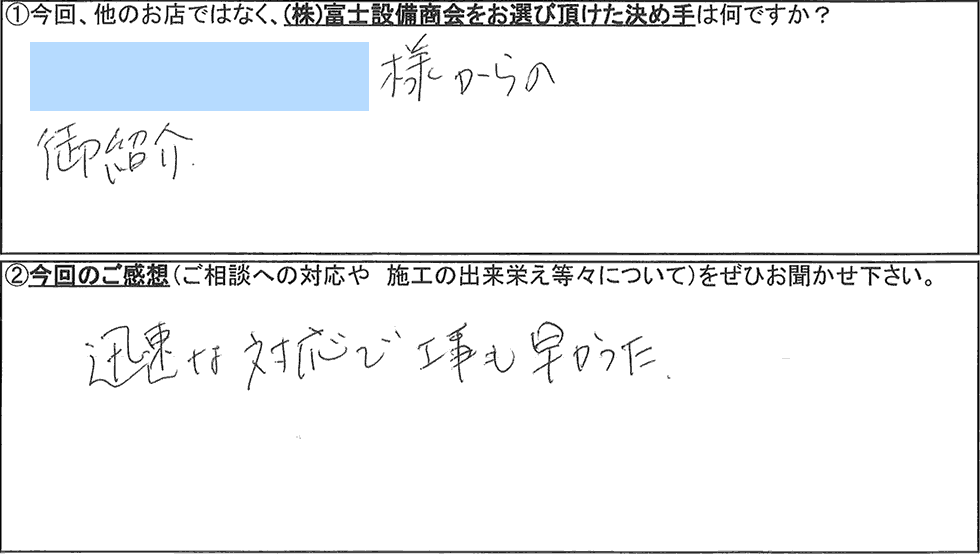 株式会社富士設備商会でダイキンエアコンの設置・交換工事を施工させて頂いたお客様からのご感想を紹介します(お名前や住所等の個人情報につきましては、それぞれのお客様から御許可頂いた範囲での公開としております)。