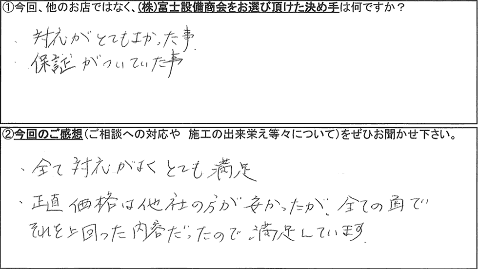 株式会社富士設備商会でダイキンエアコンの設置・交換工事を施工させて頂いたお客様からのご感想を紹介します(お名前や住所等の個人情報につきましては、それぞれのお客様から御許可頂いた範囲での公開としております)。 全て対応が良くとても満足 K 様東京都 2025年5月施工 マンション C50ZCV(ダイキンマルチエアコン天井埋込形室内機)1台、 C28ZCV(ダイキンマルチエアコン天井埋込形室内機)3台、 4M803AV(ダイキンマルチエアコン室外機)1台 富士設備商会を選んだ決め手は? ・対応がとてもよかった事・保証がついていた事 今回のご感想 ・全て対応が良くとても満足・正直価格は他社の方が安かったが、全ての面でそれを上回った内容だったので、満足しています。 <<No.712 蔵前産業株式会社様「迅速な対応で工事も早かった」(2025/5 東京都新宿区)へ No.714 善本様>>「空調設備会社に勤務する友人の紹介。設備も大事だが、施工はもっと大事ということで、家電量販店よりも設備施工会社を選んだ。安さよりも品質が、結果、低コストになるから。」(2025/6 東京都練馬区)へ