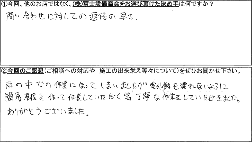 株式会社富士設備商会でダイキンエアコンの設置・交換工事を施工させて頂いたお客様からのご感想を紹介します(お名前や住所等の個人情報につきましては、それぞれのお客様から御許可頂いた範囲での公開としております)。