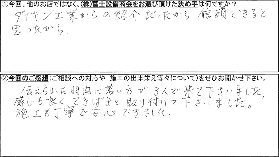 株式会社富士設備商会でダイキンエアコンの設置・交換工事を施工させて頂いたお客様からのご感想を紹介します(お名前や住所等の個人情報につきましては、それぞれのお客様から御許可頂いた範囲での公開としております)。 ダイキン工業からの紹介だったから信頼できると思ったから 匿名 様2025年6月施工 戸建住宅 S28ZMV(ダイキン天井埋込形ルームエアコン)1台、 C225ATV-W(ダイキンマルチエアコン壁掛形室内機)1台、 C285ATV-W(ダイキンマルチエアコン壁掛形室内機)1台、 2M535AV(ダイキンマルチエアコン室外機)1台 富士設備商会を選んだ決め手は? ダイキン工業からの紹介だったから信頼できると思ったから 今回のご感想 伝えられた時間に若い方が3人で来て下さいました。感じも良くてきぱきと取り付けて下さいました。施工も丁寧で安心できました。 <<No.717 H様「雨の中での作業になってしまいましたが室外機も濡れないように簡易屋根を作って作業していただく等丁寧な作業をしていただきました」(2025/6 東京都八王子市)へ No.719 Y様>>「受付事務、見積もり、工事ご担当、すべて評判通りの素晴らしい対応でした。」(2025/6 東京都文京区)へ