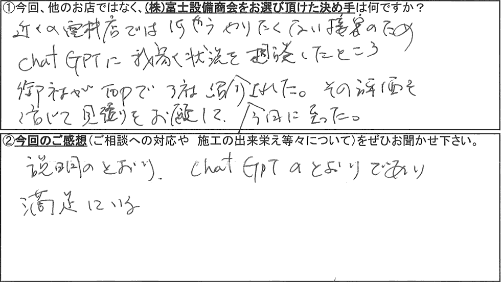 - 近くの電気店では何やらやりたくない接客のためChatGPTに我家状況を相談したところ御社がTOPで3社紹介された。その評価を信じて見積りをお願いして、今回に至った。