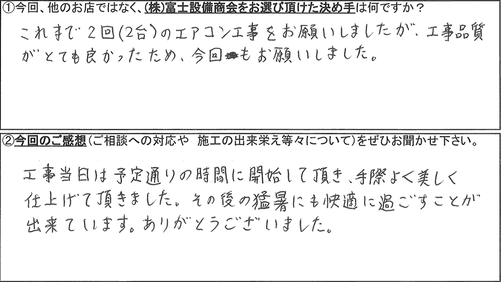 株式会社富士設備商会でダイキンエアコンの設置・交換工事を施工させて頂いたお客様からのご感想を紹介します(お名前や住所等の個人情報につきましては、それぞれのお客様から御許可頂いた範囲での公開としております)。
