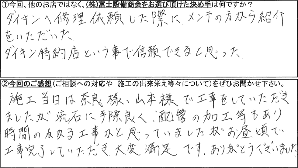 - 施工当日は奈良様、山本様で工事をしていただきましたがさすがに手際良く、配管の加工等もあり時間のかかる工事かと思っていましたがお昼頃で工事完了していただき大変満足です。ありがとうございました。