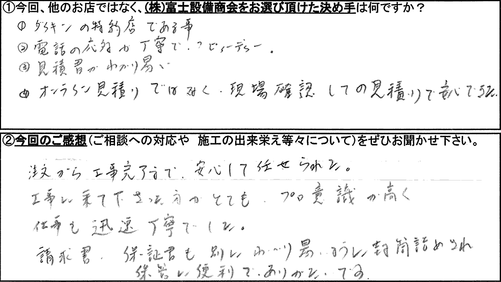株式会社富士設備商会でダイキンエアコンの設置・交換工事を施工させて頂いたお客様からのご感想を紹介します(お名前や住所等の個人情報につきましては、それぞれのお客様から御許可頂いた範囲での公開としております)。