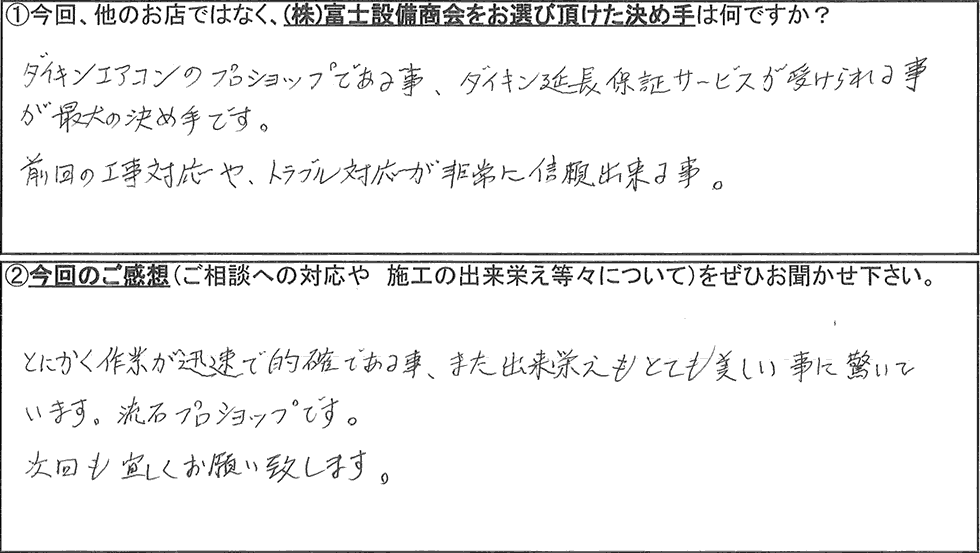株式会社富士設備商会でダイキンエアコンの設置・交換工事を施工させて頂いたお客様からのご感想を紹介します(お名前や住所等の個人情報につきましては、それぞれのお客様から御許可頂いた範囲での公開としております)。