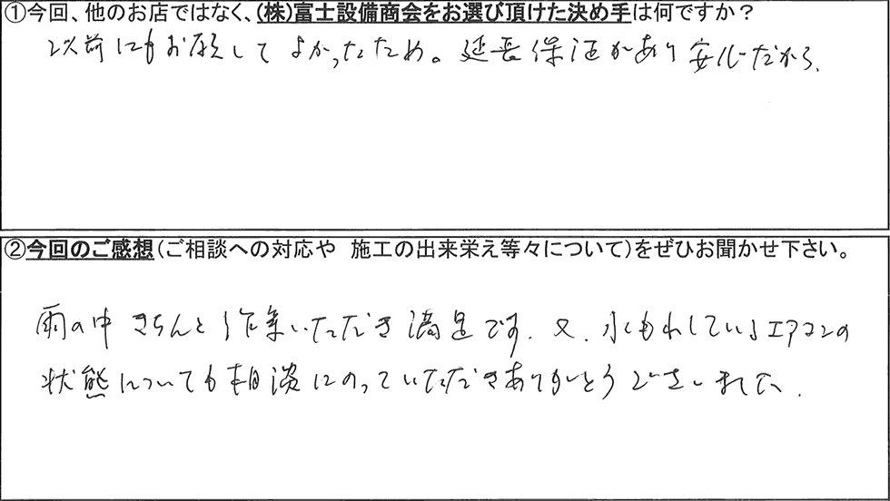 株式会社富士設備商会でダイキンエアコンの設置・交換工事を施工させて頂いたお客様からのご感想を紹介します(お名前や住所等の個人情報につきましては、それぞれのお客様から御許可頂いた範囲での公開としております)。