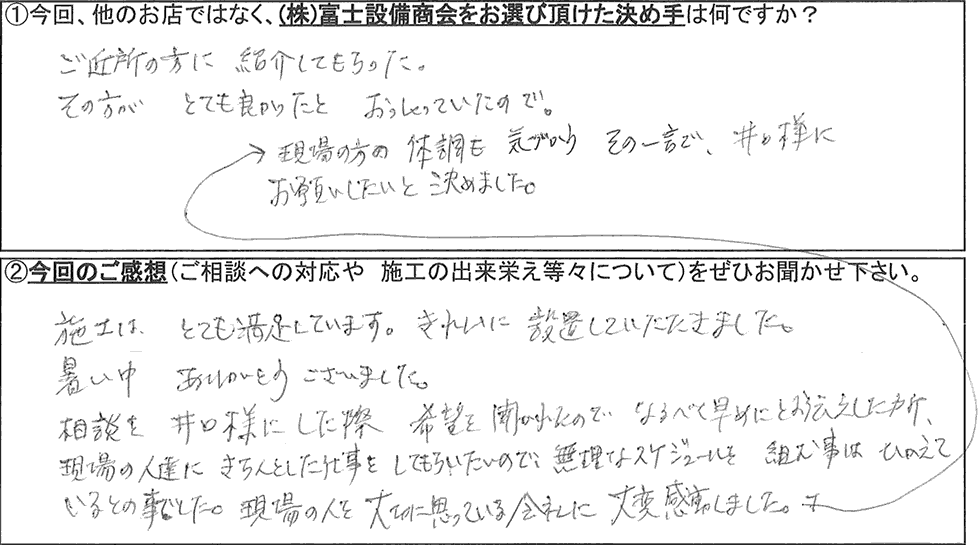 株式会社富士設備商会でダイキンエアコンの設置・交換工事を施工させて頂いたお客様からのご感想を紹介します(お名前や住所等の個人情報につきましては、それぞれのお客様から御許可頂いた範囲での公開としております)。